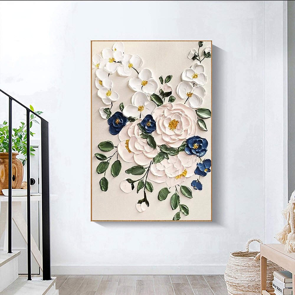 Hand Painted Oil Paintings Large Original Oil Painting White Flower Decor Abstract Wall Art Hand Paint Palette Knife Painting Heavy Textured Painting